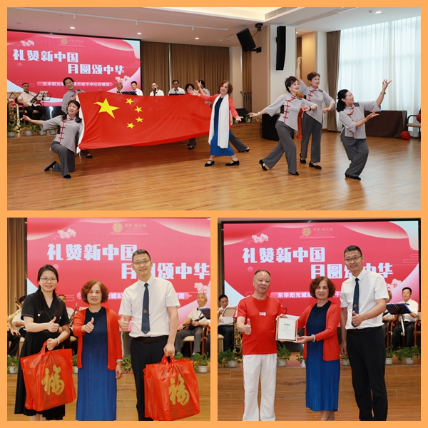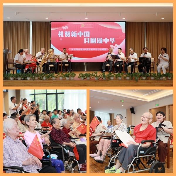 东华阳光城养老社区内张灯结彩、欢声笑语。国庆前夕,养老社区举办“红歌舞会”庆国庆文艺汇演。国庆当日,特邀东莞老干中心合唱团银铃志愿艺术服务队专属演出,为长者献上爱国主题盛宴 。