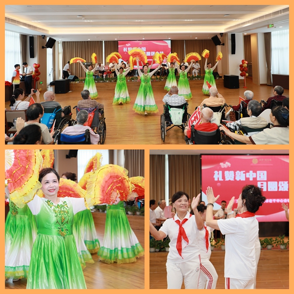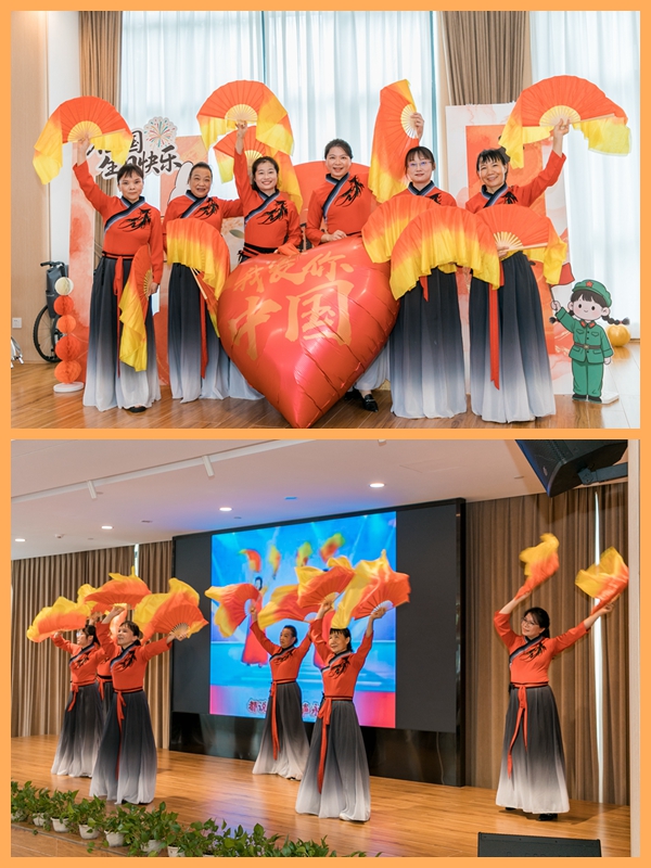 9月30日上午,社区长者与工作人员共庆祖国华诞,由医护、后勤等人员联合演绎的舞蹈《祝福祖国》成为全场焦点。平日里,他们各司其职,坚守岗位;此刻,他们暂别听诊器与工作单据,以灵动舞姿绽放别样光彩。