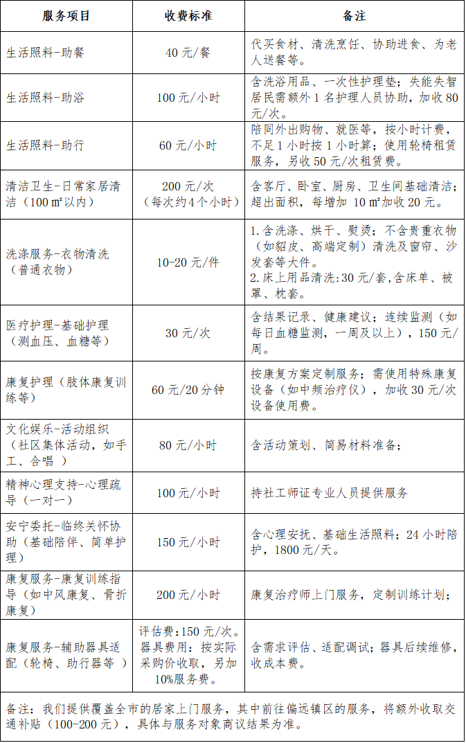 2.服务时长:单次服务时长根据服务项目确定(具体时长可在预约时咨询客服),如助浴服务单次约 60 分钟、健康监测服务单次约 30 分钟,若服务过程中因服务对象特殊情况(如突发不适需临时处理)导致时长延长,不额外增收费用。